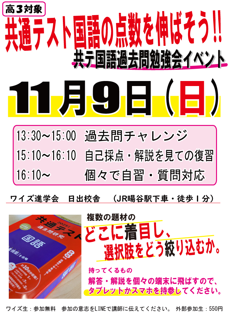高3生共通テスト過去問勉強会イベントのご案内 2025 10/07 2025年10月7日 \ お気軽にお問合せください / 高3生共通テスト過去問勉強会イベントのご案内 【中3生対象】ウルトラ勉強会のお知らせ 【対象中3生】大分県合同模試のご案内 杵築校限定「週末ライトプラン」開講のお知らせ Gregの英検コスパ最強プラン 【日出校・杵築校】自習室MAXプランのご案内 【中学生対象】理科・社会・国語ライトプラン ワイズ進学会リクルート情報 【中3生対象】ウルトラ勉強会のお知らせ