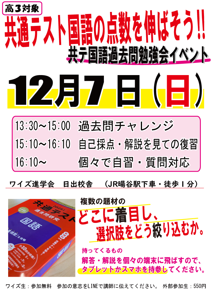高3生共通テスト過去問勉強会イベントのご案内 2025 11/28 2025年11月28日 \ お気軽にお問合せください / 高3生共通テスト過去問勉強会イベントのご案内 冬期講習のご案内【日出校・杵築校(2025-26)】 2025-2026 冬期講習のお知らせ【大分豊府校】 杵築校限定「週末ライトプラン」開講のお知らせ Gregの英検コスパ最強プラン 【日出校・杵築校】自習室MAXプランのご案内 【中学生対象】理科・社会・国語ライトプラン ワイズ進学会リクルート情報 冬期講習のご案内【日出校・杵築校(2025-26)】
